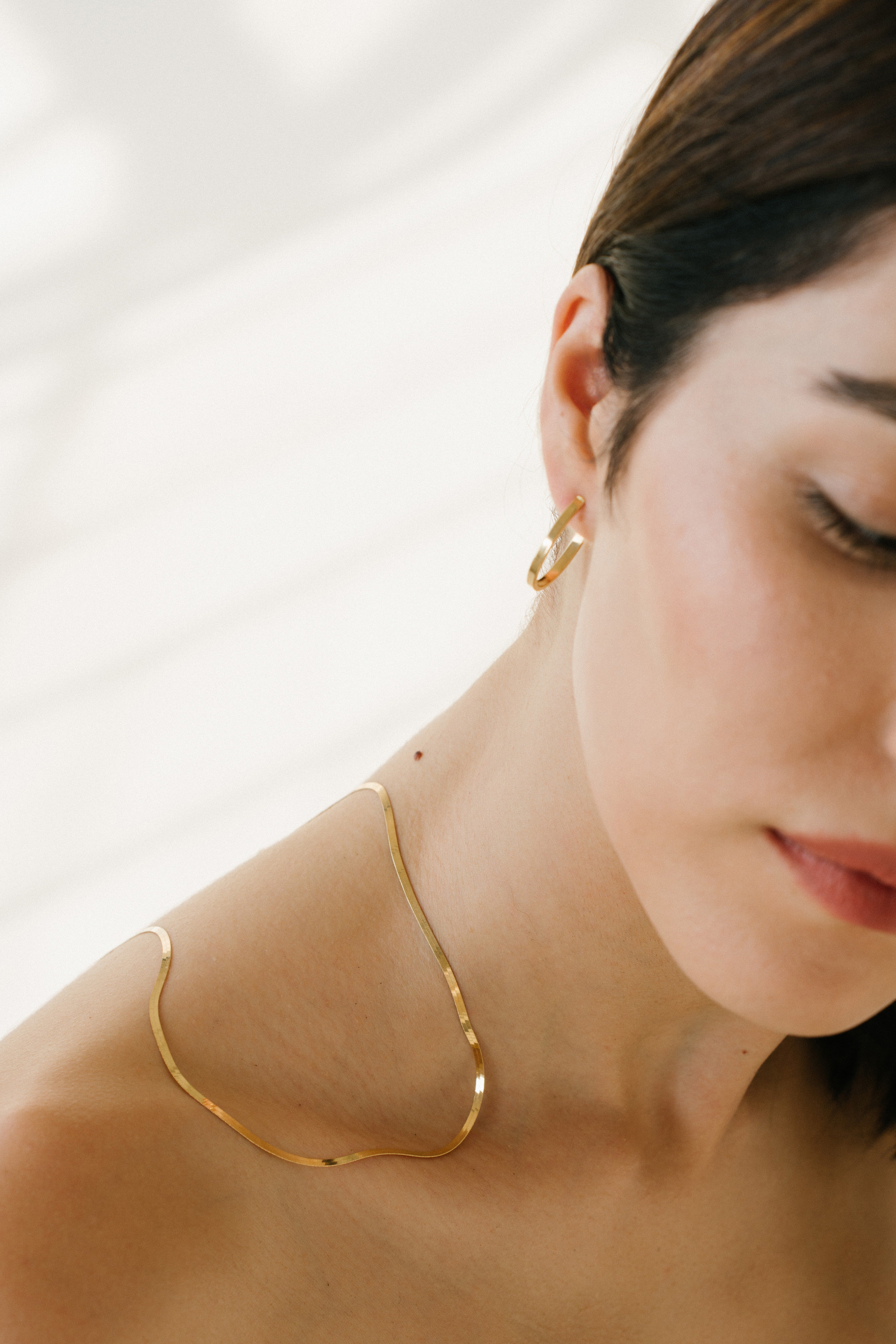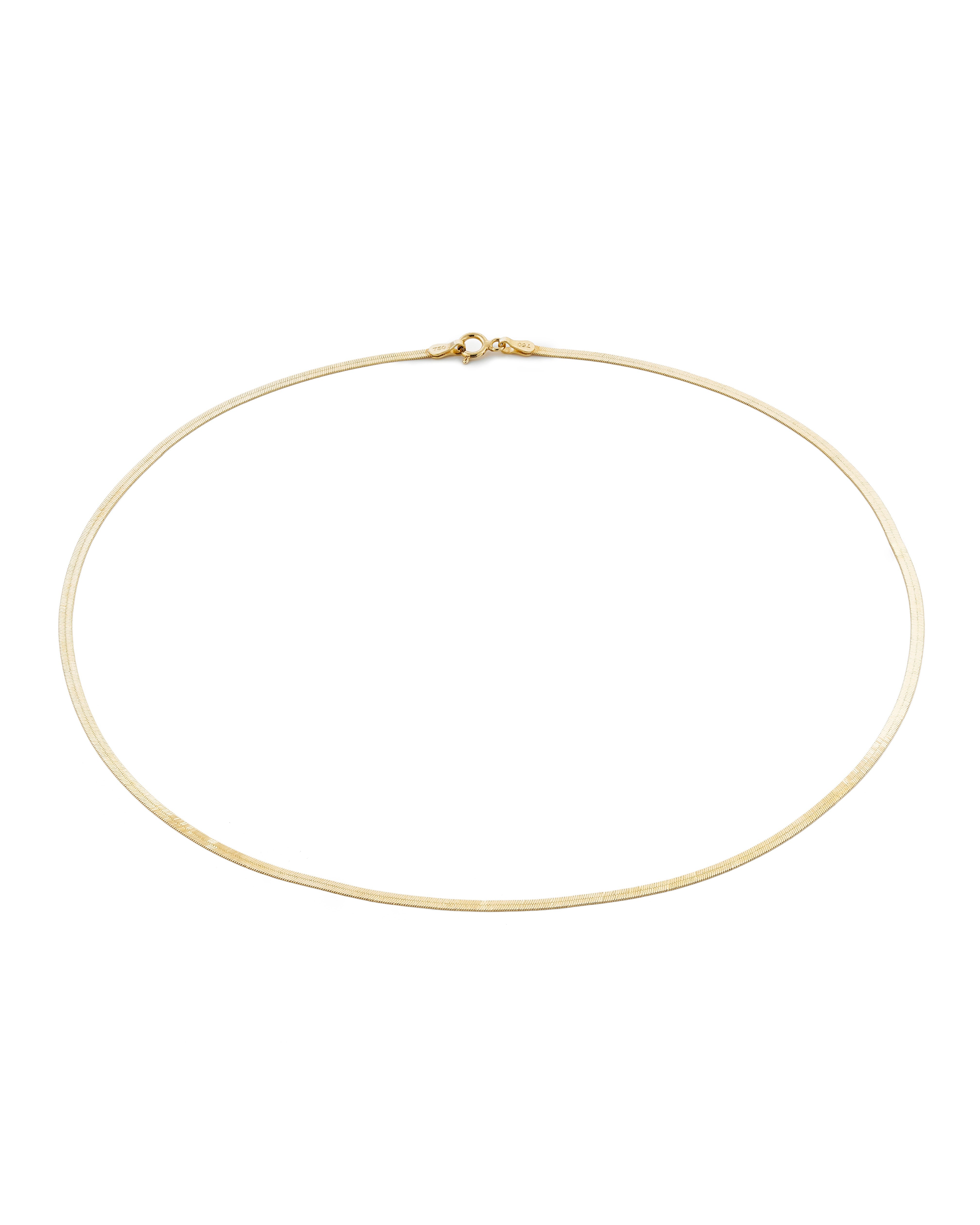 Hladký řetízek z 18k zlata v provedení snake chain vytváří čistou, lesklou linii, která jemně kopíruje krk.